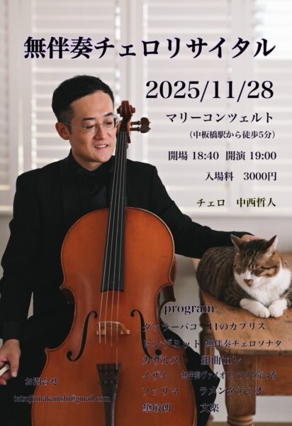 教室のピアノ発表会で何度もゲスト出演してくれた中西先生の無伴奏チェロリサイタルのお知らせです。